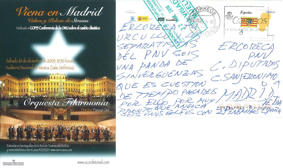 La correspondencia que he recibido esta mañana incluye nuevamente una misiva de esas que gentes de rebosantes bonhomía y dotadas de una tolerancia ejemplar me dirigen de vez en cuando para expresarme su afecto y dedicarme sus mejores deseos. En este caso, el remitente -anónimo, por supuesto- debe ser un alma delicada y sensible; un amante de la música clásica que ha querido hacerme partícipe de un concierto valses y polkas de Strauss que la Orquesta Sinfónica de Viena ofreció en el Auditorio Nacional de la Música de Madrid el pasado 26 de diciembre de 2009.