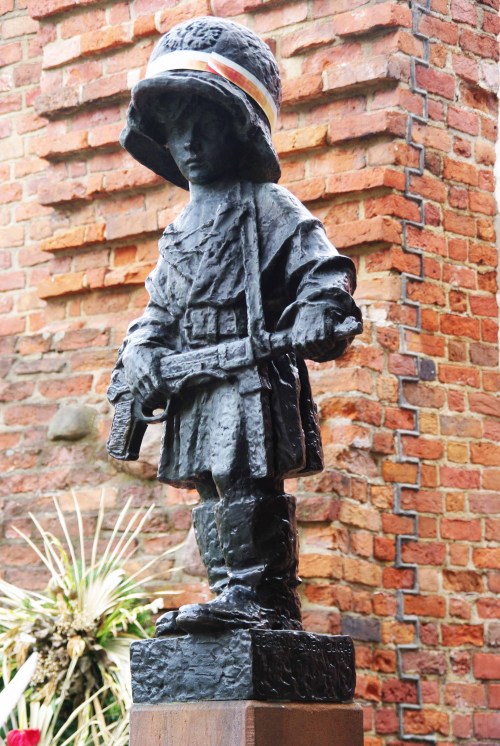 Junto a la escultura monumental que rememora la sublevación de Varsovia. Como se puede observar, el insurgente de la derecha está entrando por la boca de una alcantarilla