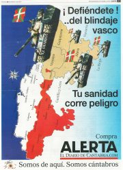 El mensaje de la portada era claro: los vascos invaden Cantabria. O quizás mejor: atacan Cantabria. Nótese que lo que avanzaba inexorablemente hacia el territorio natal de Pérez Rubalcaba no era una expedición turística de vehículos descapotables, ni una marcha cicloturista, sino una división acorazada en disposición de combate. Y frente a la ofensiva, se imponía un desgarrador grito defensivo: ¡Defiéndete!