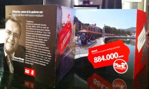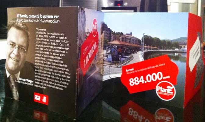 Publicidad electoral del candidato socialista a la alcaldía de Bilbao a más de dos meses de las elecciones. Repárese en el curioso detalle de que el folleto reproduce el logo del Plan E, que fue pagado con el dinero, y la deuda pública de todos los españoles, con los colores del PSOE