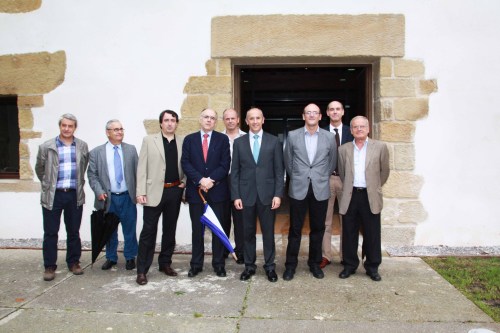 Agirretxea, Esteban eta hirurok Euskaltzaindiaren zuzendaritza batzordeko kideekin "Tolare" etxearen atarian