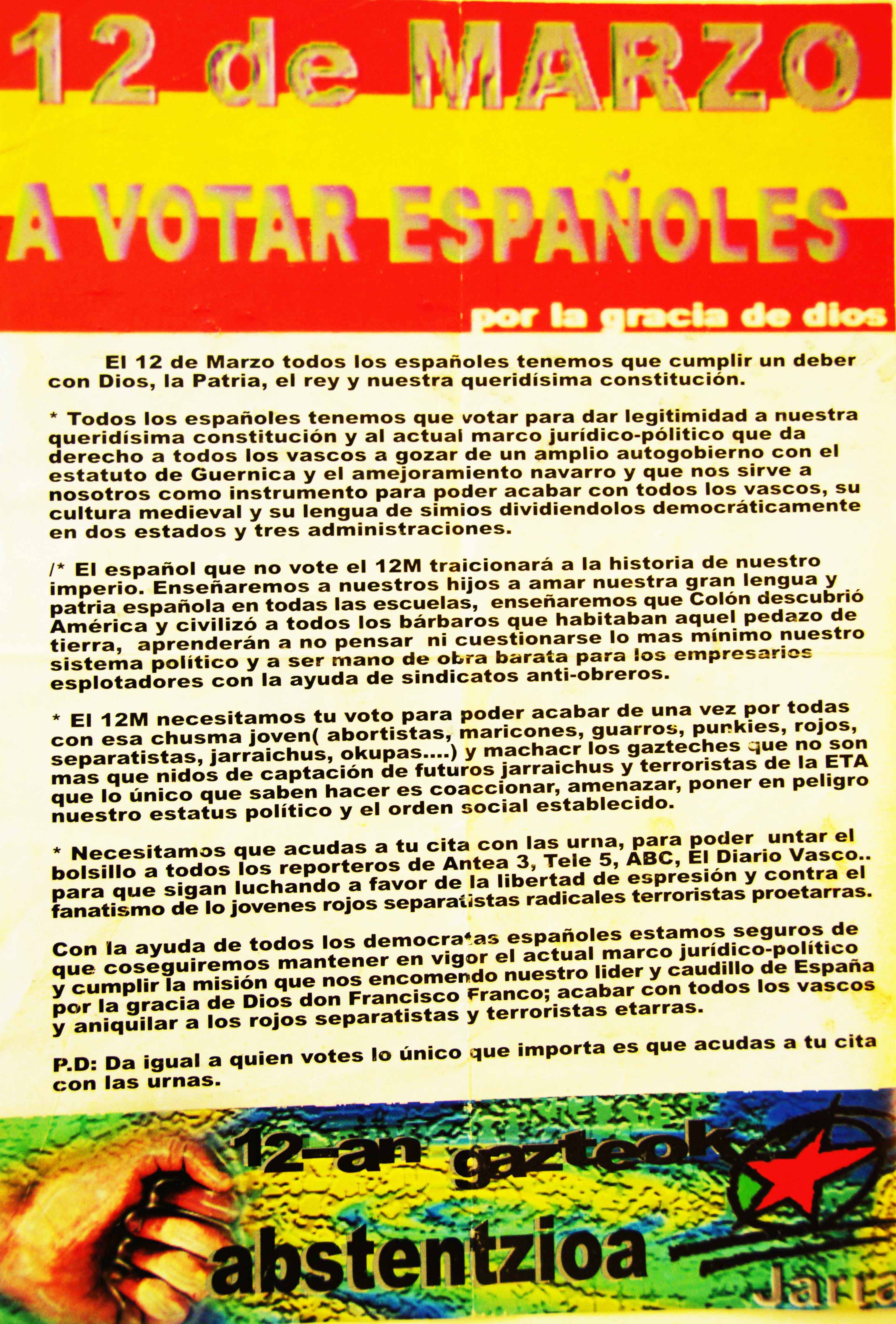 El 12-M necesitamos tu voto para poder acabar de una vez por todas con esa chusma joven (abortistas, maricones, guarros, punkies, rojos, separatistas, jarraichus, okupas) y machacar los gazteches que no son más que nidos de captación de futuros jarraichus y terroristas de la ETA que lo único que saben hacer es coaccionar, amenazar, poner en peligro nuestro estatus político y el orden social establecido.