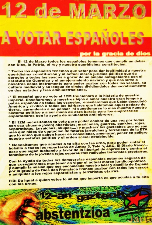 Jugando con el sarcasmo, el cartel hacía un llamamiento a todos los españoles para que participasen en sus elecciones. En las elecciones de los españoles. En unas elecciones en las que bajo ningún concepto deberían participar las formaciones políticas de inspiración nacionalista vasca. «ESPAÑOLES -decía con letras mayúsculas el mensaje central del anverso- A VOTAR». Y renglón seguido añadía: «ARRIBA ESPAÑA, ARRIBA FRANCO, VIVA LA CONSTITUCIÓN». En la parte superior, una banda compuesta por fotografías en blanco y negro, reproducía, de izquierda a derecha, un retrato en blanco y negro de Almunia -que fue, recuérdese, el candidato del PSOE en aquellos comicios- Iturgaitz, Arzalluz, Aznar y Mayor Oreja.