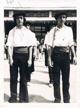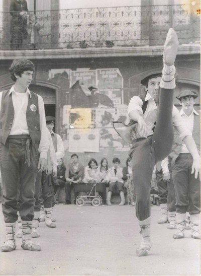 Ez dut gogoratzen zergatik baina… kontua da, ahalegin ugari egin eta gero, azkenean, ez zela asmatutako jaialdia ospatu. Eta dena bertan behera iztekotan geunden, Enkarnik, sasoi hartako nesken prestakuntza fisokoko irakasleak eskatu zigunean, maiatzean, Korpus egunean, ospitale psikiatrikoan egin ohi zen jaira dantzan egitera joateko. Eztabaida izan genuen joan ala ez. Baina kementsua zen Enkarni, eta konbentzitu egin gindun. Beraz, Bermeoko ospitale psikiatrikoan gauzatu zen gure lehenbiziko ariketa publikoa. 1976ko Korpus egunean. Argazkiak ere badaude egun horretako gure jarduna irudietan jasotzen dutenak. Txapel beltza, alkandora zuria, gerriko gorria eta praka urdinekin aritu ginen egun hartan. Bermeoko kutsu arrantzalea eman nahirik… mahoizko prakak sartu genizkon jantziari. Harrez gero, urtetan ibili izan gara uniforme horrekin.