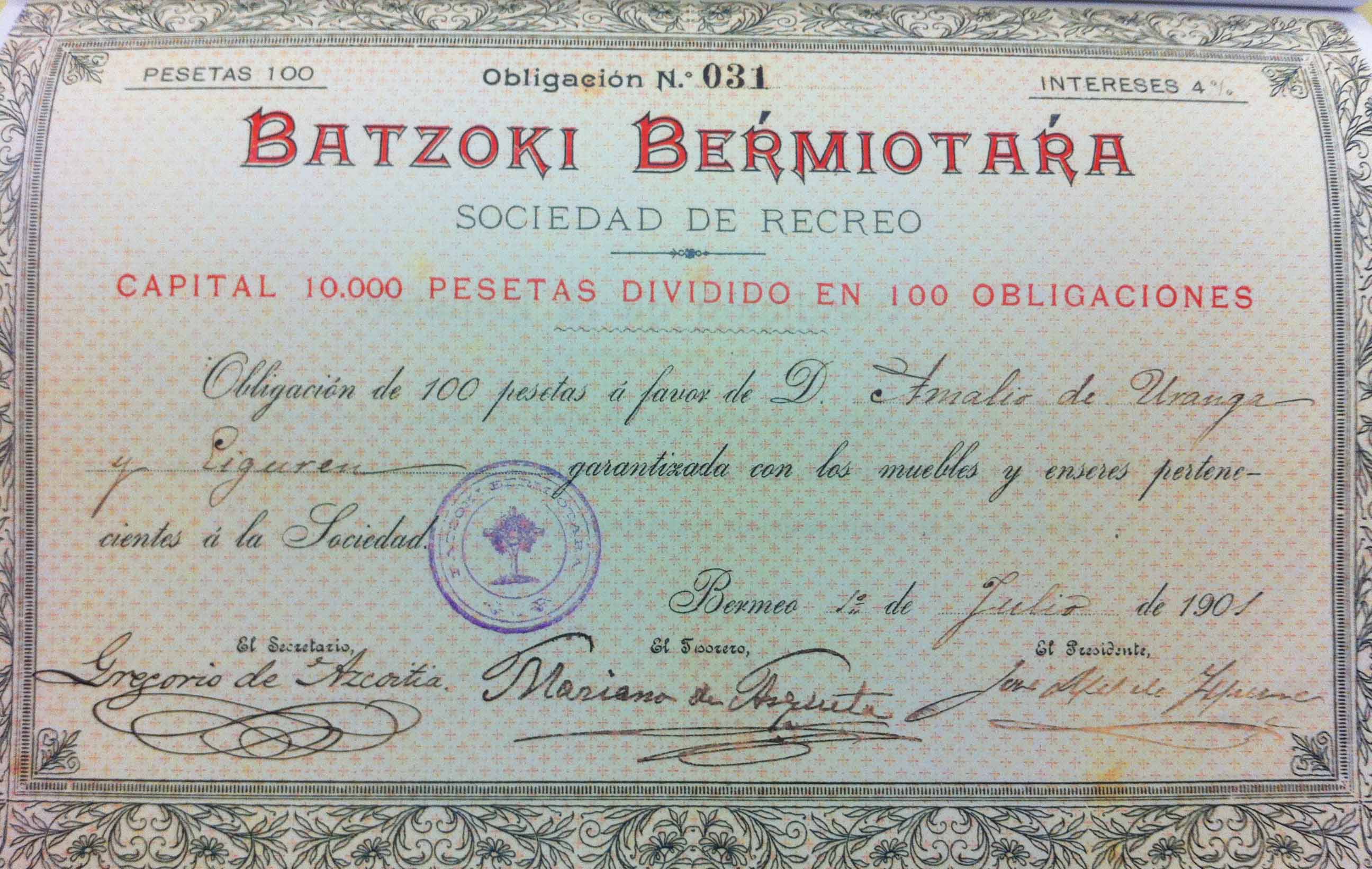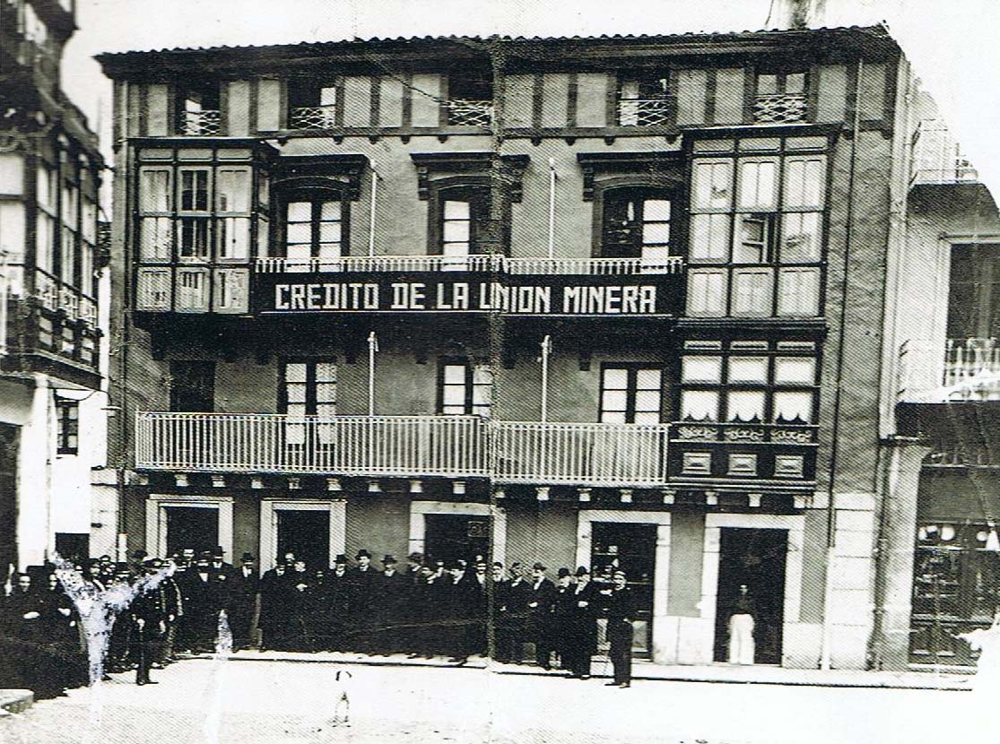 Benantzio Goitiaren lehendakaritzapean sortu zen Batzoki Bermeotarra, argazkian ikusten den etxearen bigarren solairuan egon zen; hots, urte batzuk geroago «Credito de la Unión Minera» banketxeak bere egoitza jarriko zuen leiku berean.