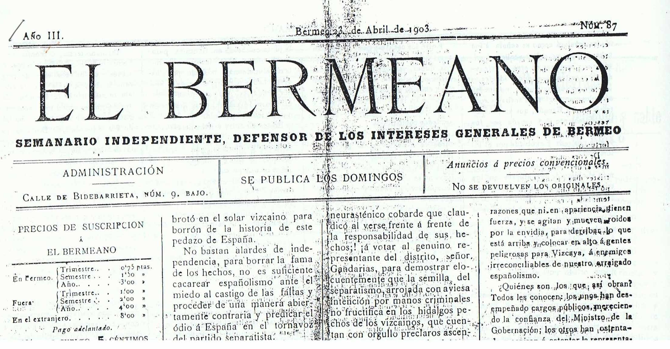 Hauxe zen El Bermeano astekaria. Ez dakigu Bermeoko Udalak bere kontra aurkeztutako auzia zertan gelditu zen, baina bizi izandakotik ikasiz, tono apalagoan argitaratu zen 1903tik aurrera. Jeltzaleak udalaren gehiengoa galdu izanak ere -1903ko abenduan izan ziren udal hauteskundeetan gertatu zen hori- bere eragina izango zuen, zalantza barik, El Bermeano fase lasaiagoan hasi zedin.