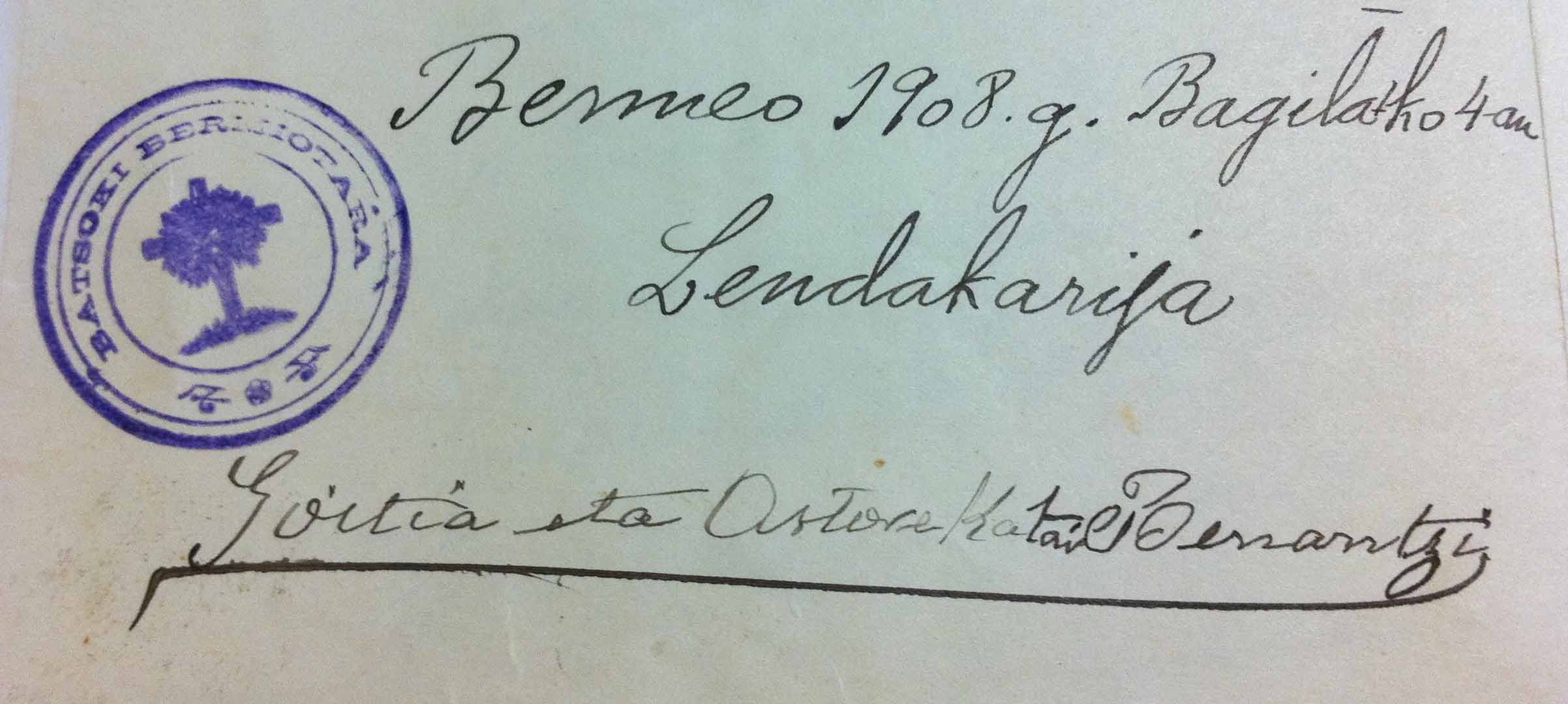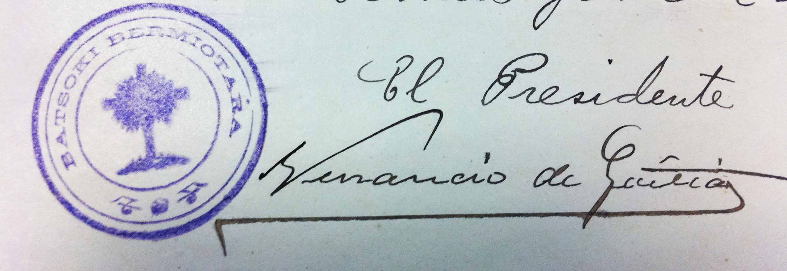 Batzoki Bermeotarra-k Benantzio Goitia lehendakaria izan zen garaian -1908 urtean- idazkietan erabiltzen zuen menbretea