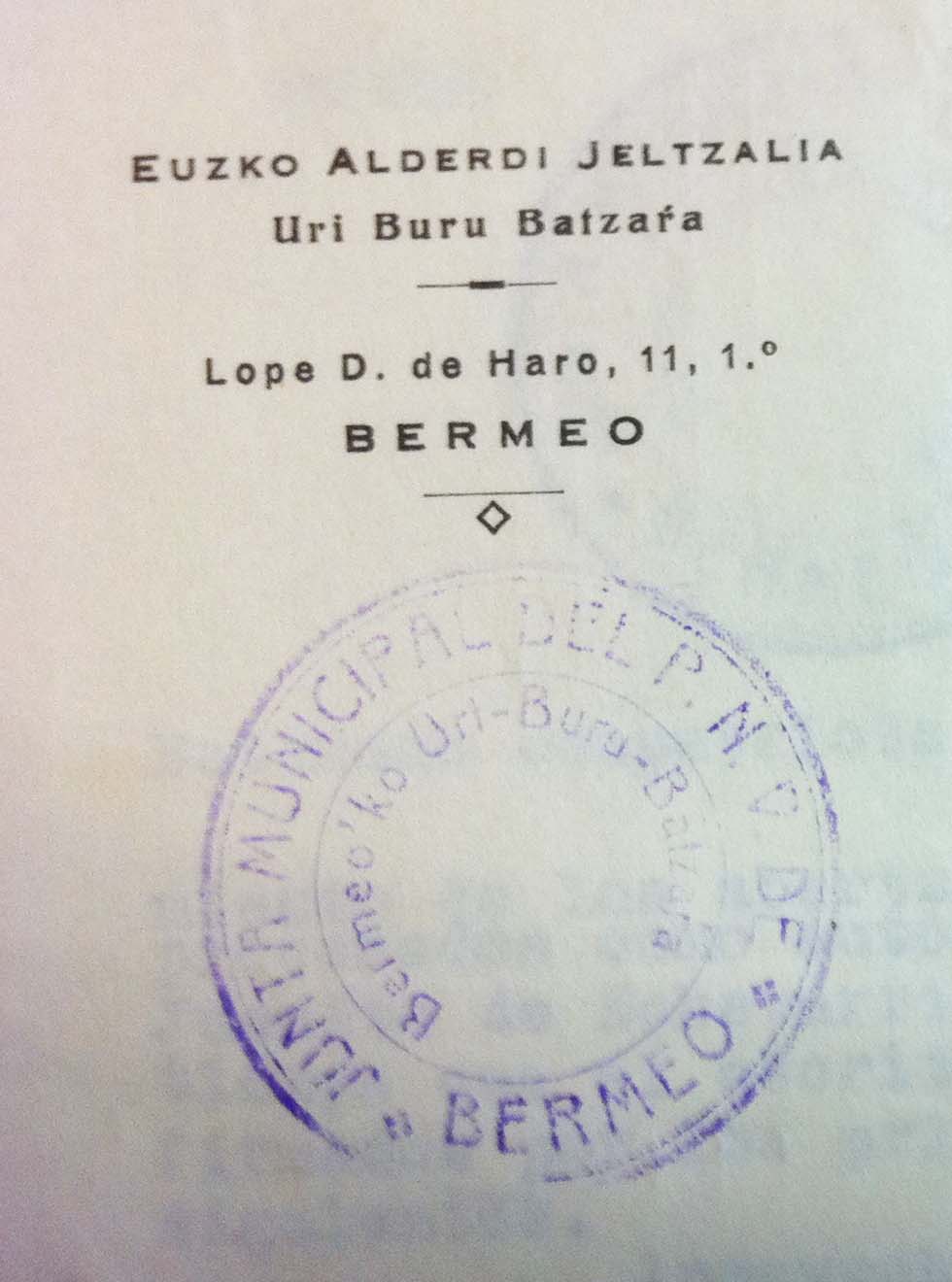 “Conforme le anunciamos en nuestra última carta, le comunicamos el detalle de las personas que forman la Directiva elegida en la reunión celebrada el día de hoy, a sus siete horas de la tarde, en el domicilio sito en esta villa, paseo de don Lope Dïez de Haro, 11, 1º derecha, al objeto de dejar constituida la sociedad denominada Centro Vasco-Euzko Batzokija. Dichos nombramientos recayeron en las personas siguientes