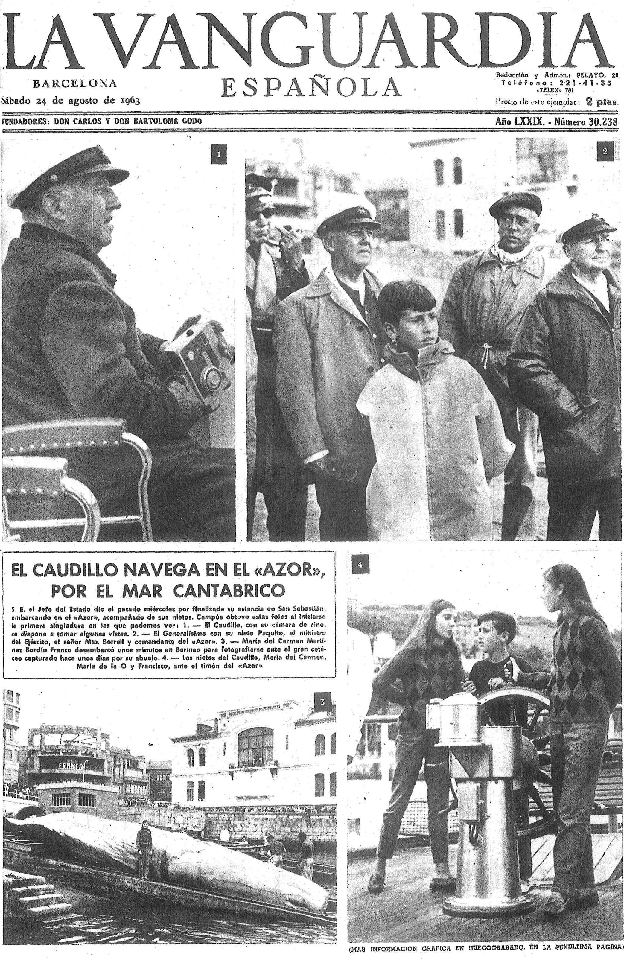 No me consta que, entre 1960 y 1962, el incomparable líder que dirigía con mano diestra los destinos de la reserva espiritual de occidente, lograse capturar algún cachalote en sus escaramuzas estivales por el Golfo de Bizkaia. Y la ausencia de reseñas periodísticas que registren algún lance sobresaliente en la actividad pesquera del caudillo, invita a sospechar que durante estos años no hubo gestas marítimas dignas de mención. Para rato iban a permitir los servicios del Propaganda del régimen que una captura del Azor, susceptible de ser vendida como una proeza deslumbrante del jefe del Estado, pasase desapercibida ante la opinión pública. Si la prensa calló sobre este punto, significa que no había de qué hablar.