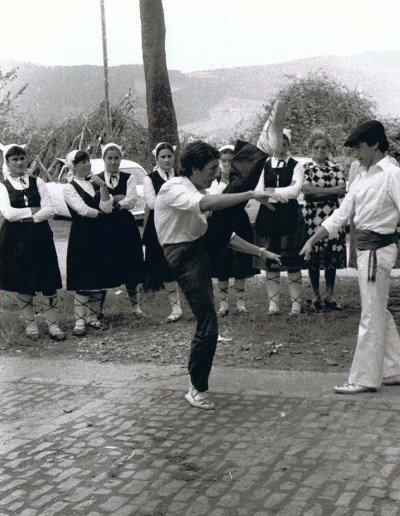 1979ko irailaren 8an, Meza nagusiaren ostean, Almikako eleizaren arrean aurreskua dantzatzen. Gezurra dirudien arren, aurreskularia -hots, ezkerreko hanka jasota daukan dantzaria- ni-neu naiz, 19 urterekin.