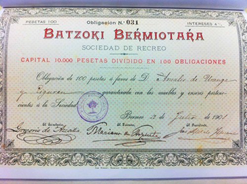 Kemen handiarekin hasi zuen Amalik jeltzale ibilbidea. Indarrez eta gogotsu. Batzokiari eutsi behar zion elkarteak, 100 pezetatako 100 obligazio jaulki zituen, 10.000 pezetatako kapitala osatuz. Bada, hHorietatik 10 Amalik berak erosi zituen, batzokiko obligazionistarik handienean bihurtuz. Hona hemen bere izenean jaulkitako obligazio bat.