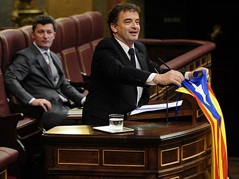 El portavoz de ERC, Alfred Bosch, en el momento en el que protagoniza el gesto simbólico-mediático de exhibir la senyera estelada desde la tribuna del Congreso